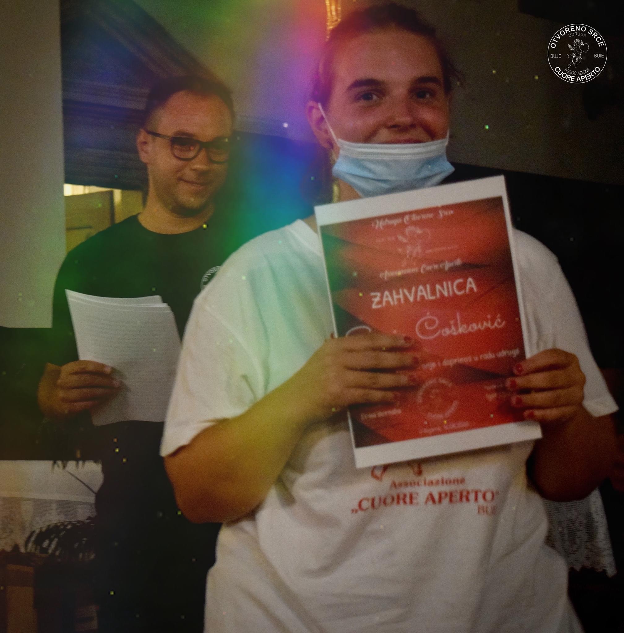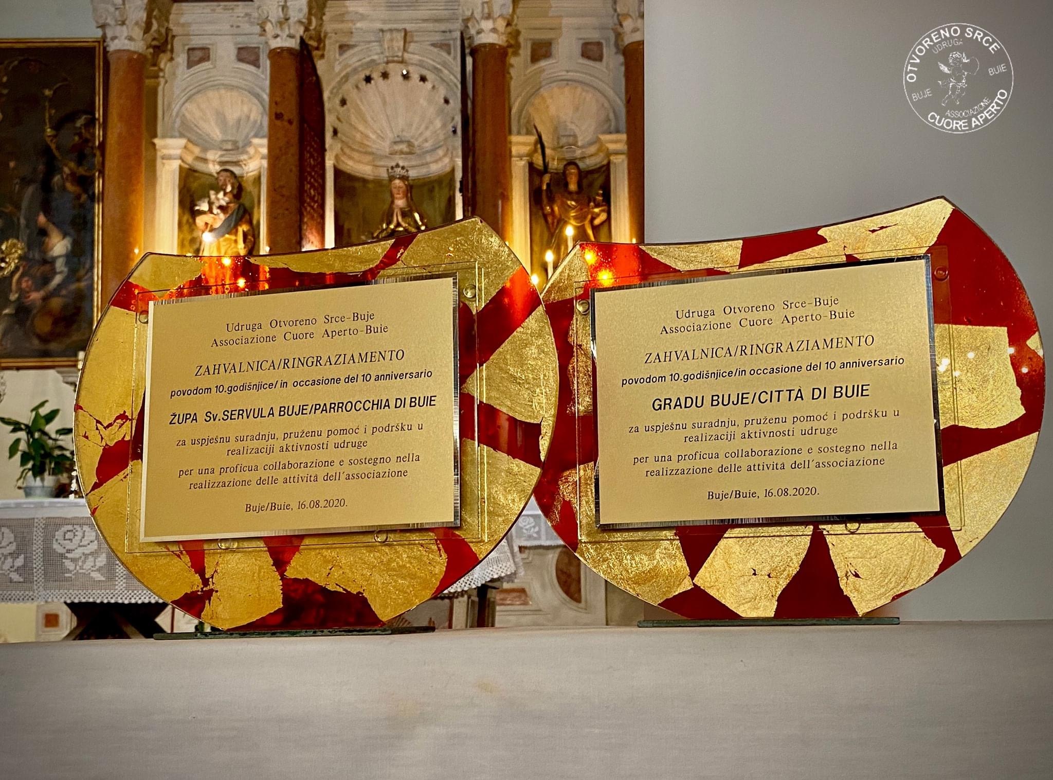 Na proslavi, nakon sv. Mise predvođene župnikom don Marcinom Madejom, a koju su glazbeno animirali Otvoreno srce, njihov rad je prikazan kroz kratak video uradak. Tom prilikom uručene su i dvije zahvalnice: Gradu Buje za uspješnu suradnju, pruženu pomoć i podršku u realizaciji aktivnosti udruge. U zadnjih nekoliko godina udruga je korisnik gradskoga proračuna iz kojeg se financira njihov godišnji program, a i koriste gradski prostor u kojem se odvijaju sastanci, probe i organizacija aktivnosti udruge. Plaketu je preuzeo gradonačelnik Fabrizio Vižintin te je uputio riječi pohvale mladima koji, neprestano aktivni, doprinose životu i dobru društva.