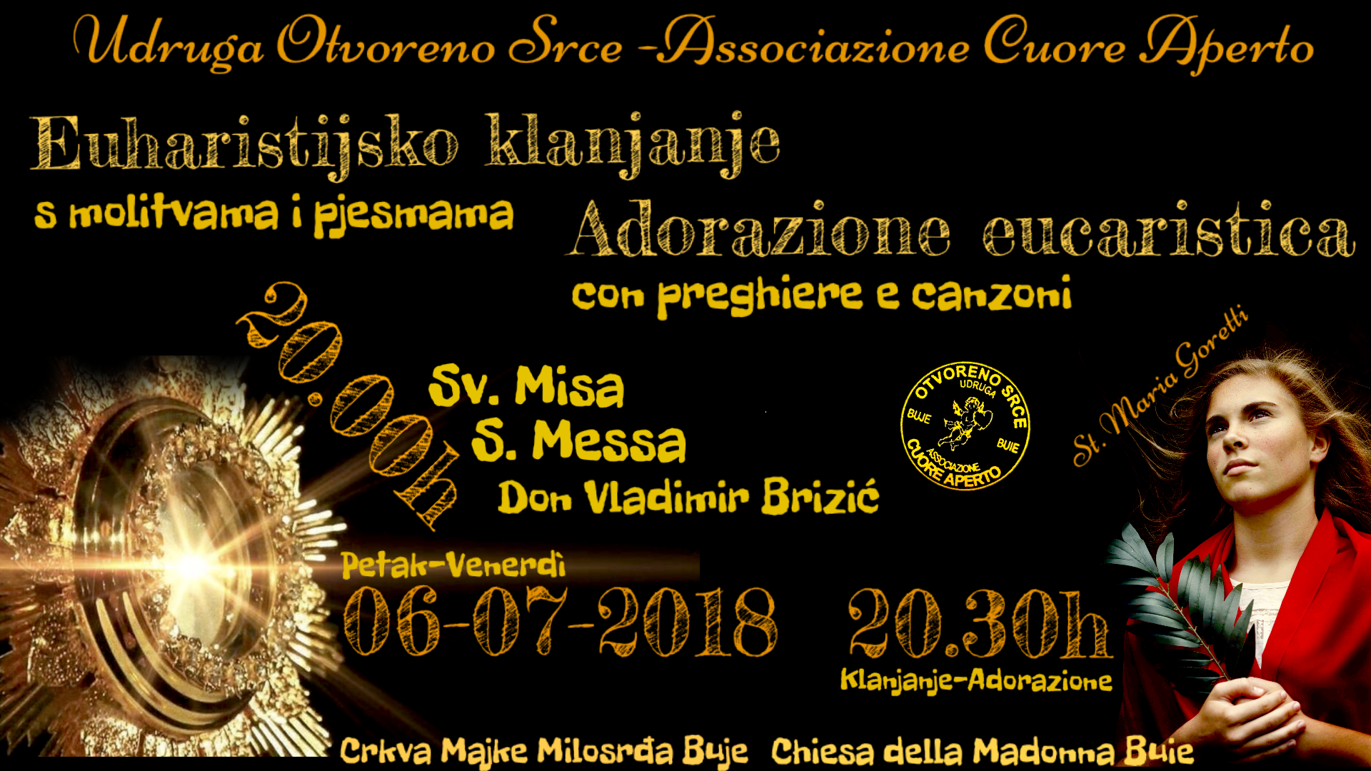 [:it]06.07. Si è tenuta l’ultima Adorazione Eucaristica prima della pausa estiva. Numerosi i fedeli che hanno partecipato alla Santa Messa celebrata dal parroco di Buie, Don Vladimir Brizić e all’adorazione guidata dal vicario Don Marčin Majden assieme ai nostri giovani che animavano il tutto con canzoni e meditazioni. Cogliamo l’occasione per ringraziare tutti coloro che ci seguono, sostengono e credono in noi. Le nostre attività riprenderanno in settembre. Auguriamo a tutti una serena e benedetta estate.