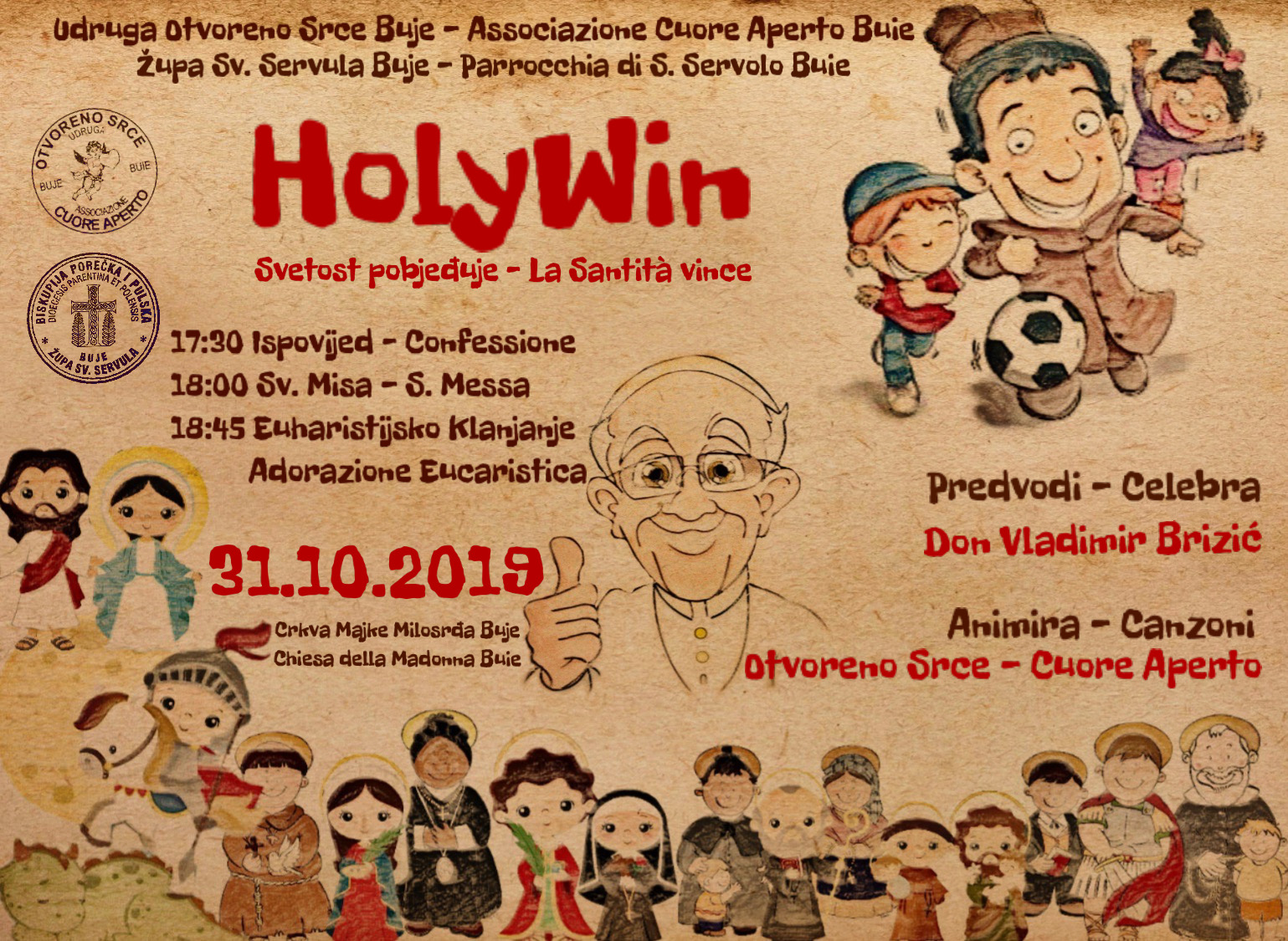„Holywin – Svetost pobjeđuje“, bdijenje po cijeloj zemlji uoči blagdana Svi sveti. Naziv je to inicijative koju već nekoliko godina organizira Ured HBK za mlade, Hrvatske biskupske bonferencije uoči Svi sveti. Cilj je podsjetiti mlade na značenje svetkovine i kršćanske svetosti, kao i molitve za pokojne kako bi ih se odvratilo od trenutne tendencije da se slavi „Halloween“ (Noć vještica), zbog čega naslov aludira na igru riječima „Holywin“. Stoga se kršćanske inicijative umnožavaju kao odgovor na Noć vještica, a i kao priprema za blagdan Svi sveti kojeg Katolička Crkva slavi 1. studenog, slaveći time nadu u bolje sutra, gdje ljubav pobjeđuje nad svime pa čak i nad smrti. Vezano uz to, mladi udruge Otvoreno Srce zajedno sa župom Buje, petu godinu zaredom organizirali su molitveno bdijenje u čast svih svetaca. Svetu Misu i euharistijsko klanjanje predvodio je župnik Vladimir Brizić, popraćeno duhovnim pjesmama i molitvama mladih Otvorenog Srca. Kapelan, don Mauro Boccadoro, bio je na raspolaganju cijelu večer za sakrament ispovijedi. Brojna djeca, mladi i stariji pridružili su se inicijativi u nadi da će biti ustrajni u vjeri, strpljivi i ponizni Isusovi svjedoci, jer kako nam je otkrio riječima župnik Brizić, potrebni su nam sveci u „trapericama i tenisicama” koji će širiti po svim medijima, kršćansku poruku bez straha da će biti „glas koji viče u pustinji“, bez straha da će biti znak proturječnosti koji ide protiv struje ili koji neće odustati zbog kritika onih koji banaliziraju opasnost od Halloweena.