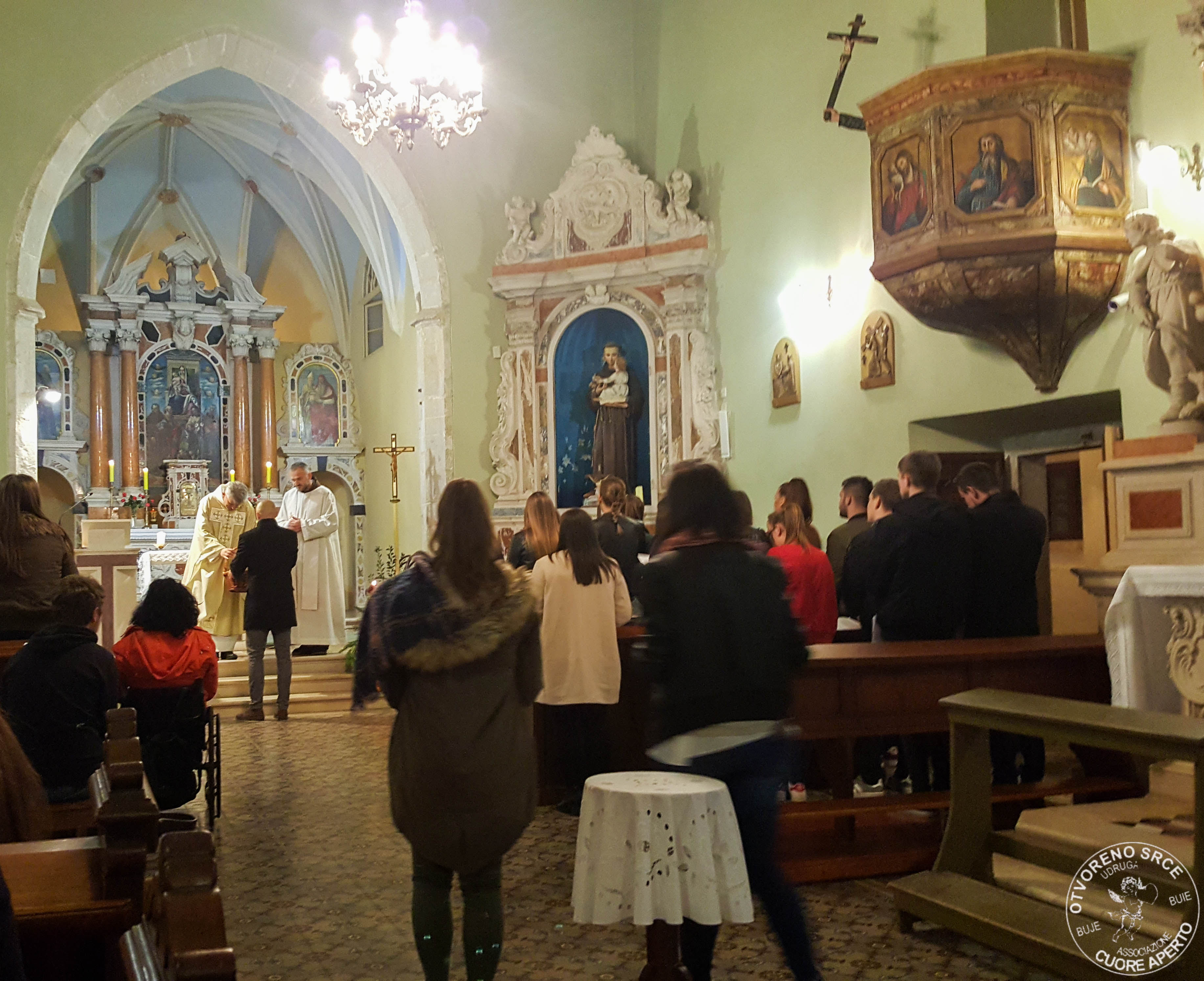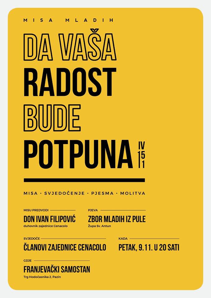 [:hr]U petak 09.11. bili smo na Misi mladih u Pazinu koju su započeli jednom mjesečno organizirati fratri franjevačkog samostana Marijina pohođenja iz Pazina. U prepunoj crkvi mladih, sv. Misu je predvodio don Ivan Filipović iz Zajednice Cenacolo koji je zajedno sa svojih dvoje mladih svjedočio o obraćenju i izbavljenju iz ropstva ovisnosti o drogama te o djelovanju njihove zajednice. Sv. Misu je animirao zbor mladih župe sv. Antuna iz Pule.