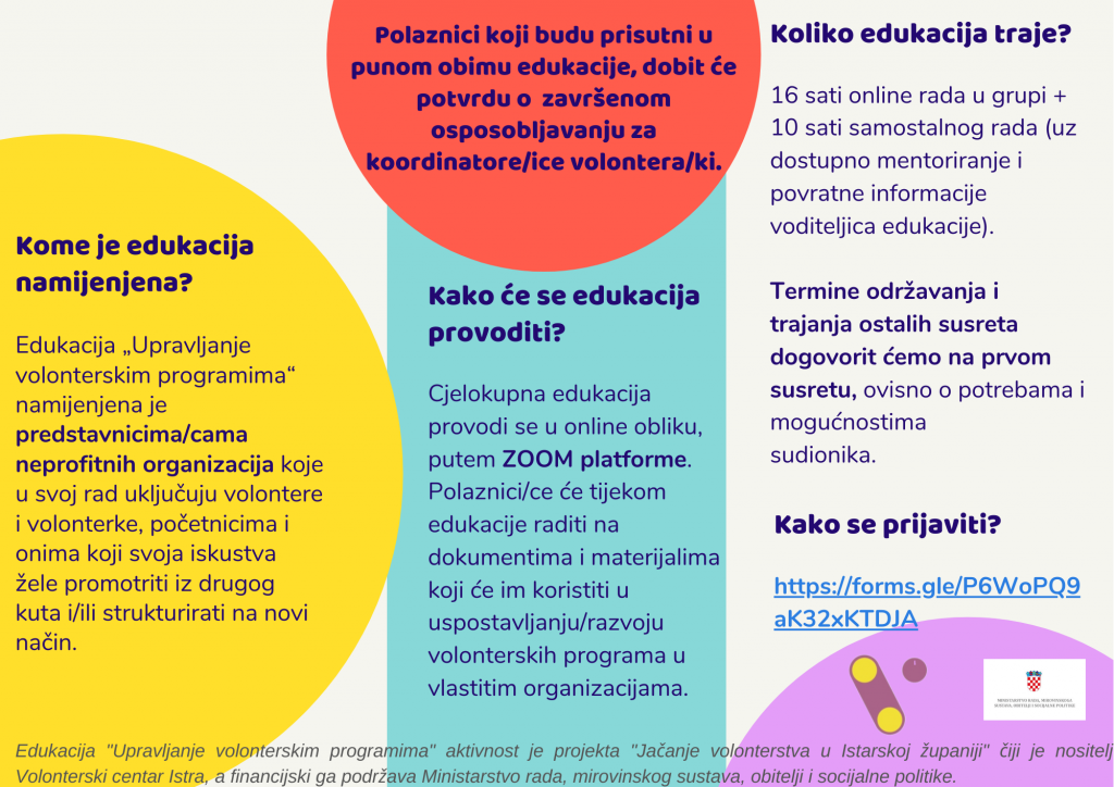Od 05.11. do 29.12. naš predsjednik je sudjelovao u edukaciji “Upravljanje volonterskim programima” za koordinatore volontera koja je provedena online u organizaciji volonterskog centra Istra. 15 sudionica i sudionika su tijekom 8 susreta, razmjenjivali svoja iskustva rada s volonterima, svoje ciljeve vezano uz uspostavu i razvoj volonterskih programa organizacije, kao i sva pitanja i nedoumice s kojima su se susreli na putu. Kroz online susrete i individualne zadatke obrađene su sve faze menadžmenta volonterskog programa. Izrađen je i volonterski program za 2021. za našu udrugu.