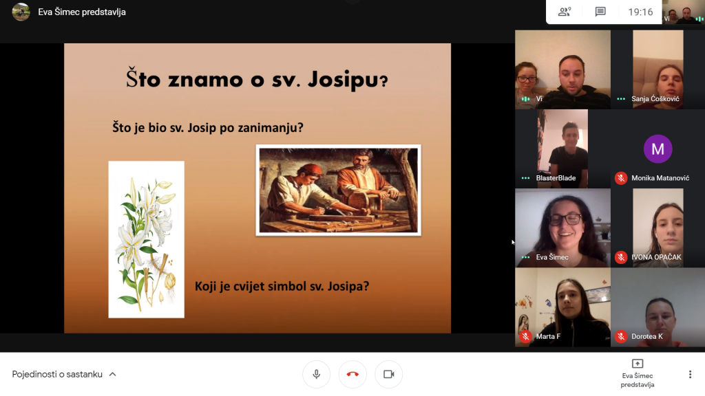 20.03.2021. Proslavili smo svetkovinu sv. Josipa, zaštitnika obitelji i uzor očevima, a osobito ga štujemo u ovoj 2021. godini. Okupili smo se na online susretu mladih i proučili Josipov život, upoznali čudo stepenica u New Mexico. Na kraju smo se svi nasmijali i još bolje upoznali kroz online verziju igre “Pogodi tko sam”.